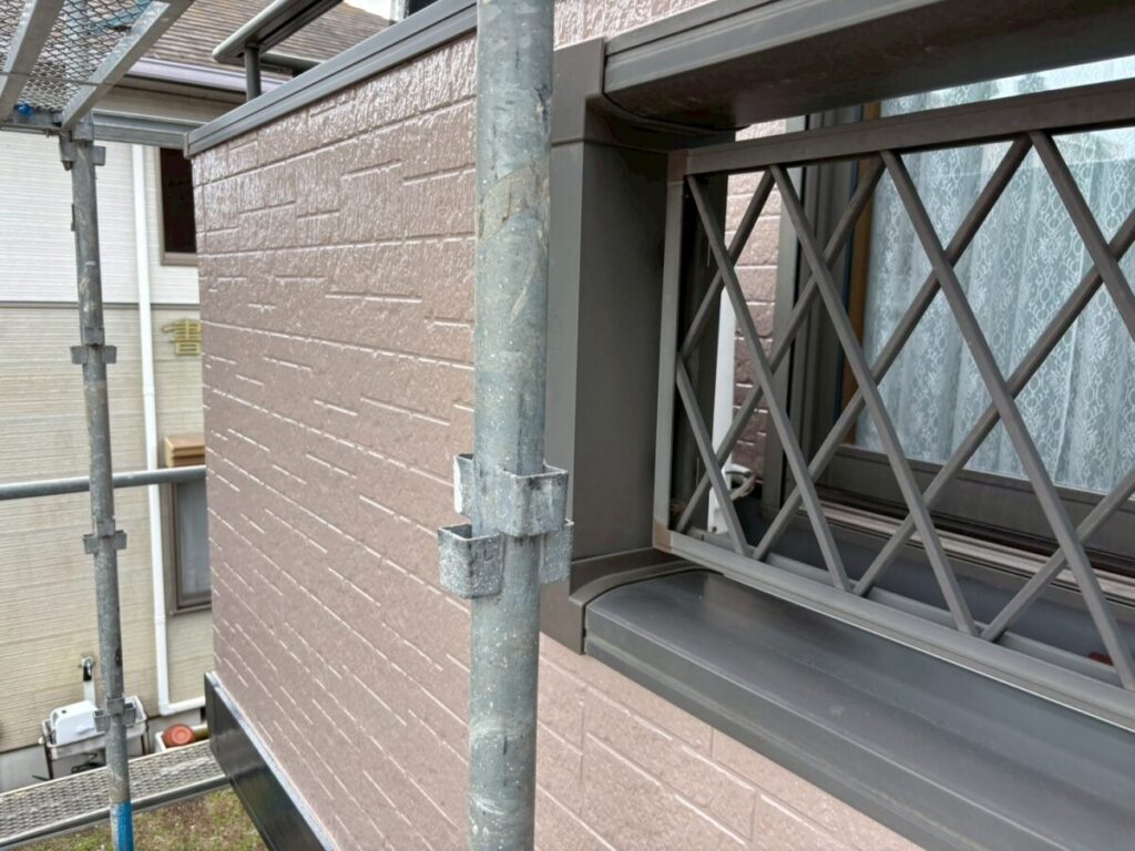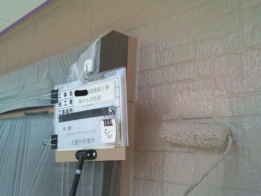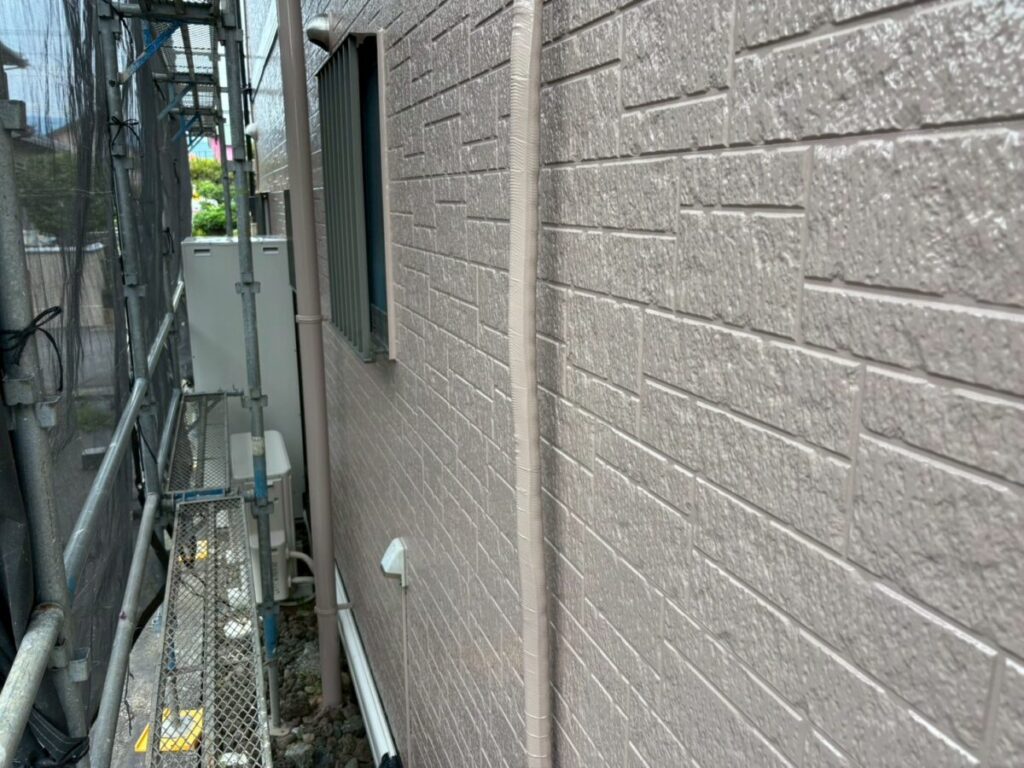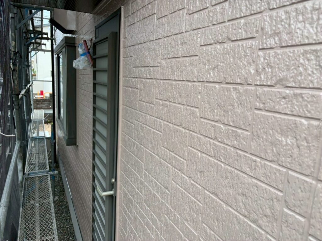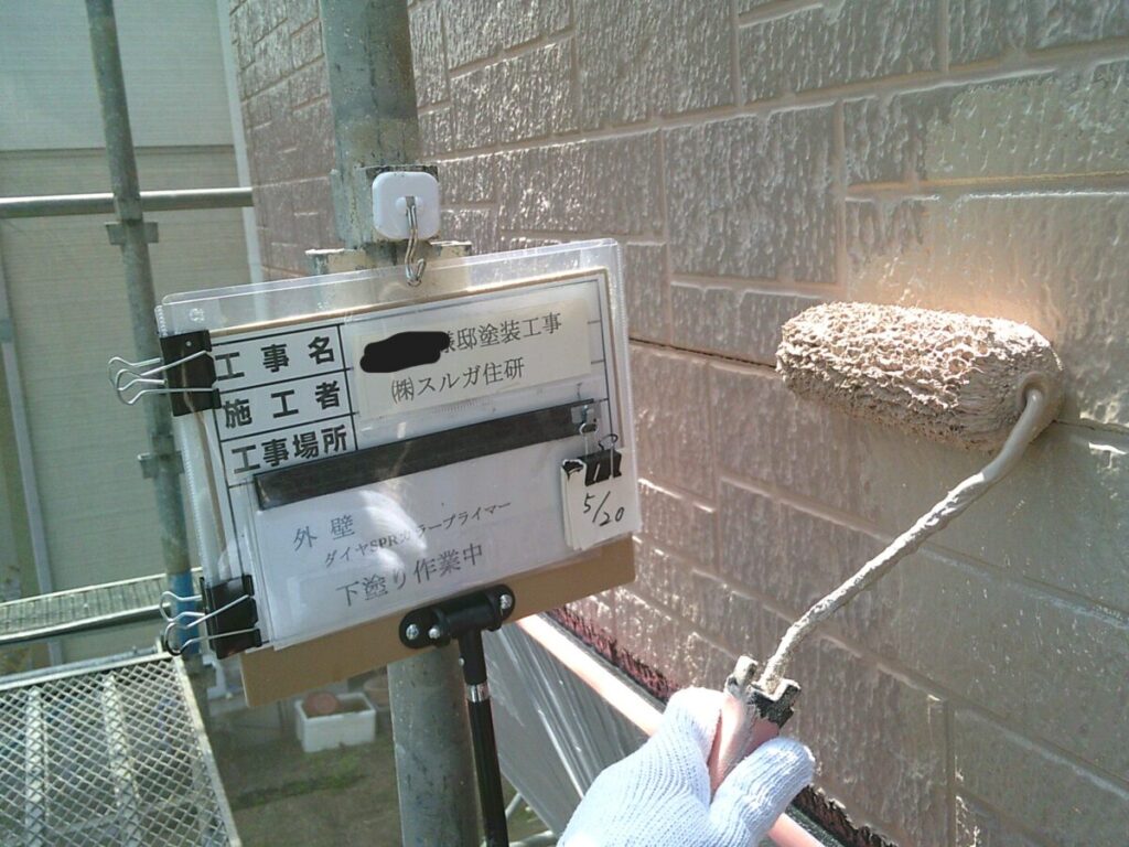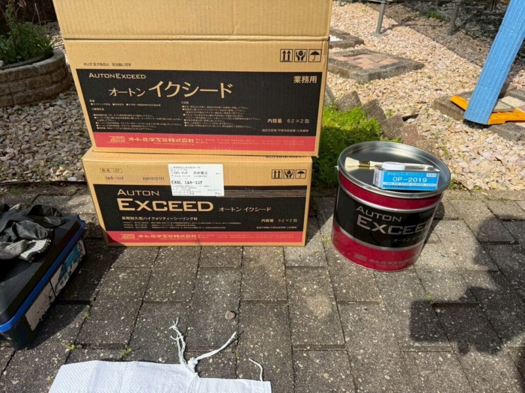 汚れた外壁に高圧洗浄をかけて洗っていきます。この時に付帯部の窓やシャッター、軒天、雨樋なども一緒に洗浄を掛けて綺麗にしていきます。乾燥ししたらシーリング工事に移ります。シーリング材を撤去し、プライマーを塗布したらシーリング材を充填してヘラで撫で綺麗にならしていきます。今回は高耐候性シーリング材オートンイクシードを使用しました。