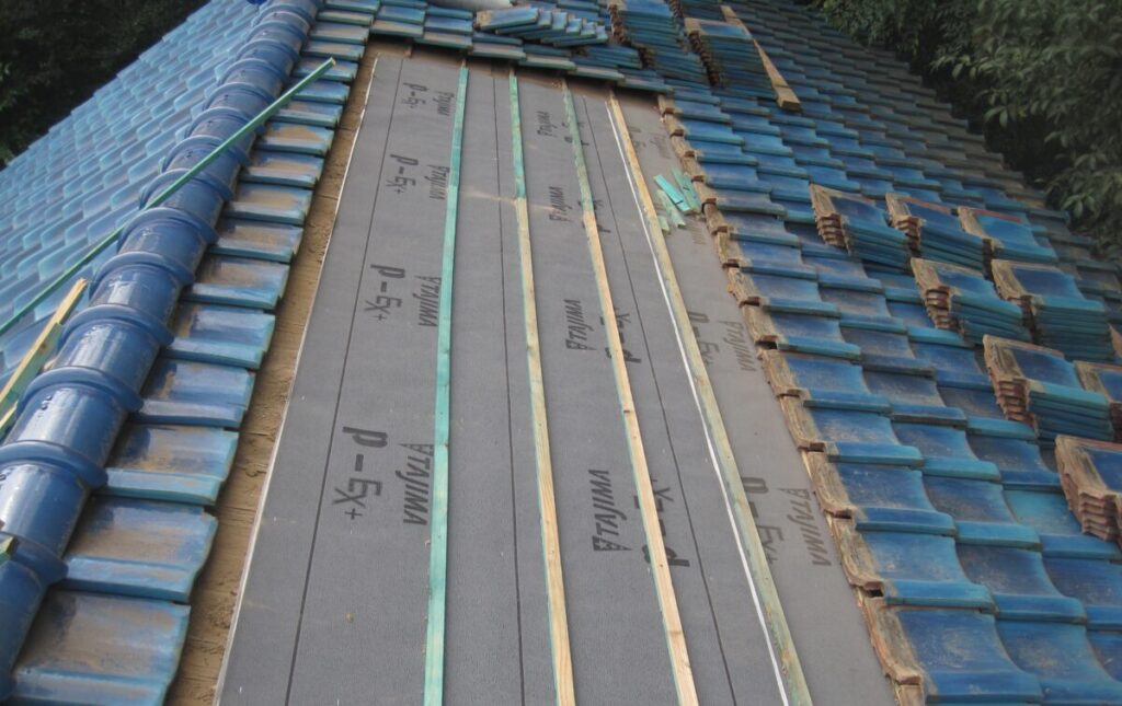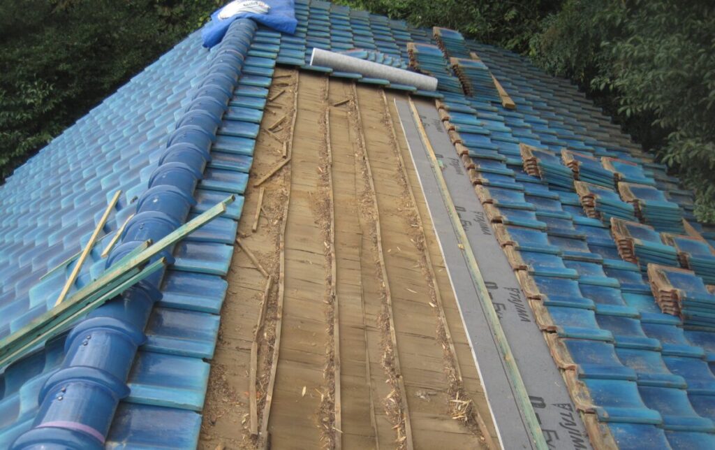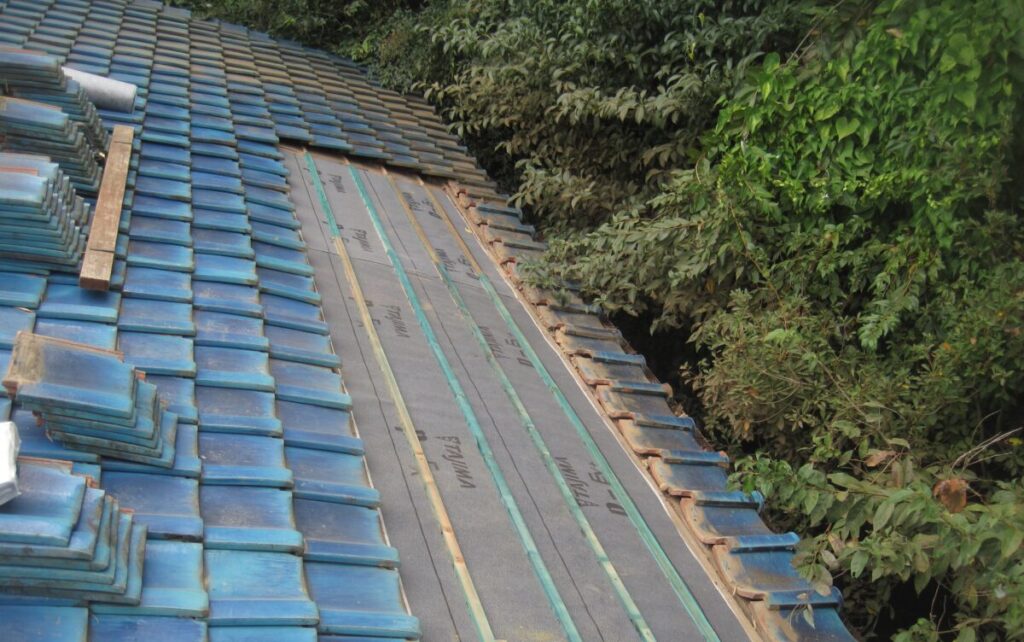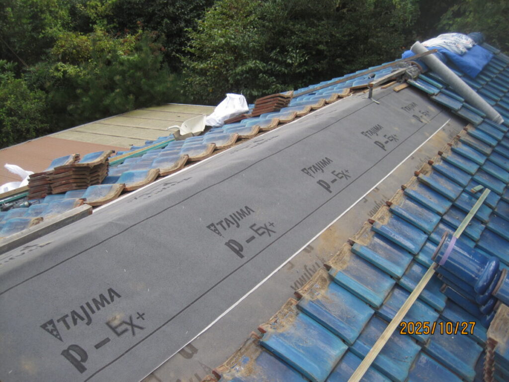 既存の瓦を一部分剥がし、瓦を引っ掛けている瓦桟を撤去したら新しいルーフィングを軒先から張っていきます。一度にすべての瓦を撤去しないのは天候を見ながら雨が降っても大丈夫なように最低限の部分しか屋根瓦を撤去しないようにしています。ルーフィングを張ったら新しい瓦桟を取り付けて既存の瓦を戻していきます。