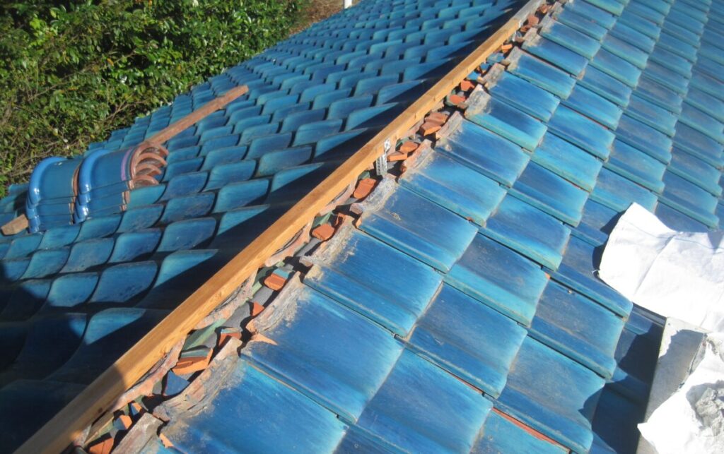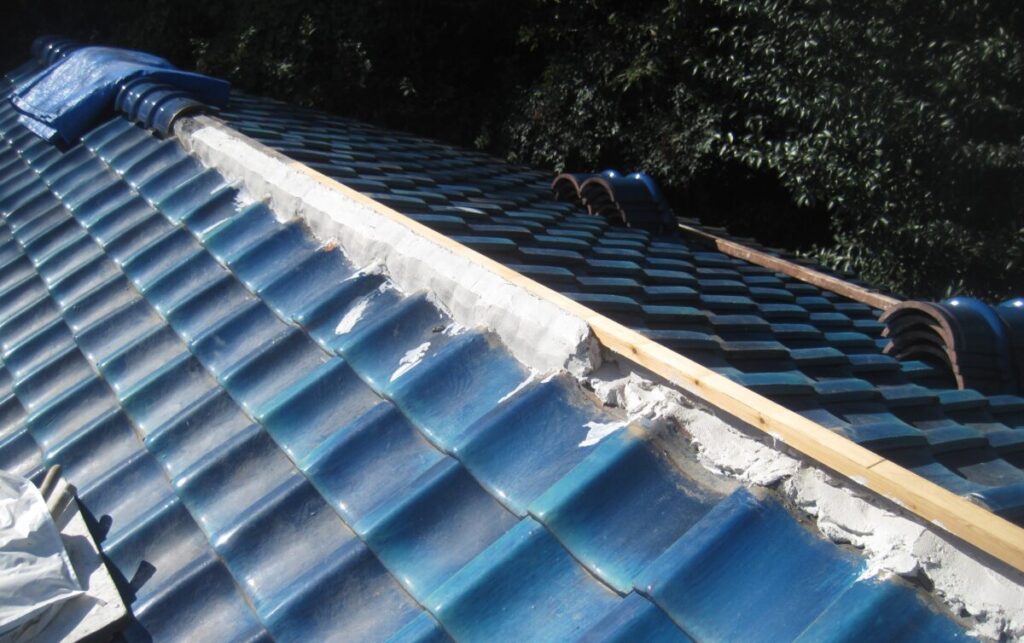 既存の棟はのし瓦を積まずに地震に強い冠だけで完成している棟になります。棟の冠瓦を外したらモルタルを解体しながら崩していきます。耐震金具に乗っかっている棟心材を交換したら南蛮漆喰を塗り込み冠瓦をパッキン付きステンレスビスで留めたら完成です。