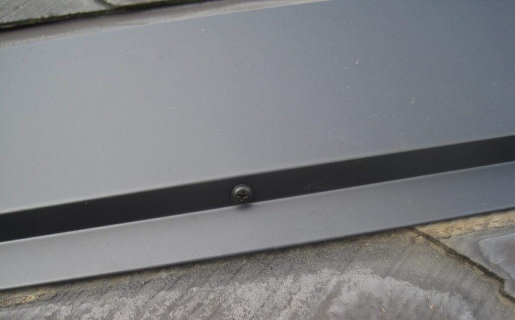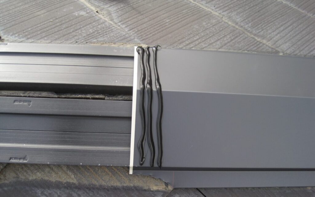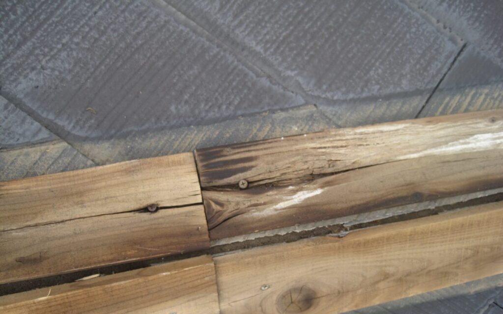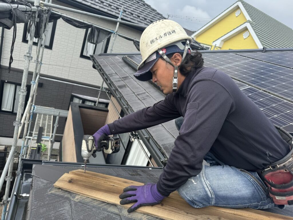 隅棟(すみむね)とは屋根の角から斜めに伸びている棟の事です。初めに棟板金の釘をすべて抜き棟板金を取り外すと木製の棟下地が出てきます。棟下地も長い釘やビスで屋根の下地に打ち込まれていますのでそれを取り外すと棟下地が簡単に撤去することができます。清掃後に新しい棟下地に使用する樹脂製貫板のタフモックをステンレス製のビスを使用して屋根の下地にしっかりと留めていきます。最後に棟板金を棟下地に被せたらパッキン付きステンレスビスで横から棟下地に打ち込んで留めていきます。