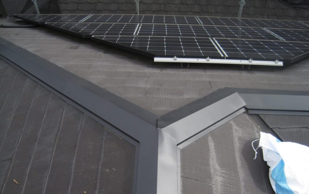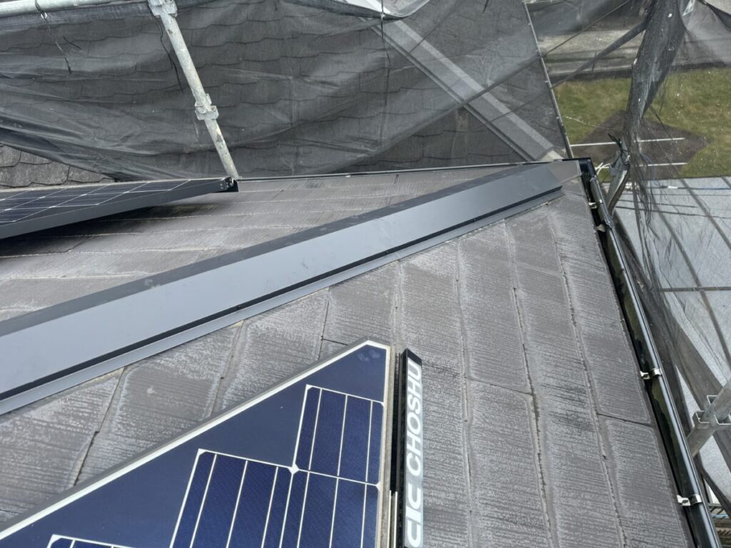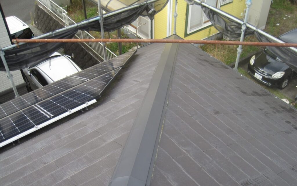 本棟と隅棟が完成しました。棟交換の工事期間は2日位です。棟板金の色はブラックです。棟板金の色も数種類の中から選ぶことができます。お施主様も強風のたびに気になさっていたらしく安心されていました。