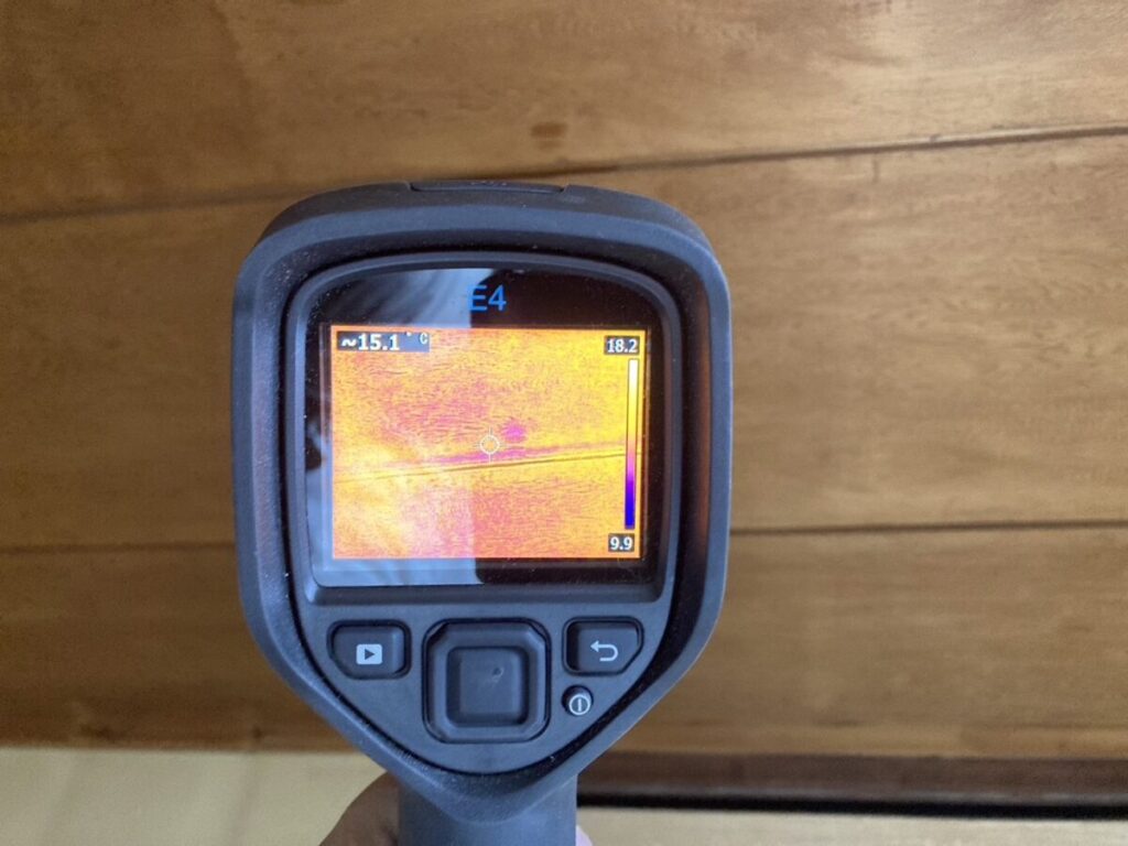 さらに、サーモグラフィーを使って確認すると、該当箇所には水分を含んでいる反応がしっかり出ていました。目視だけでは分かりづらい場合でも、こうした機器を使うことで、雨水のまわり方をより具体的に把握することができます。