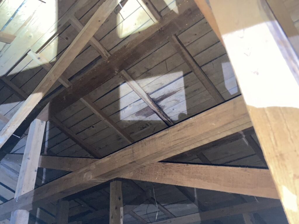 その後、屋根裏へ上がり、野地板の状態を確認しました。すると、やはり雨漏りの影響で野地板が濡れている状態となっており、屋根から雨水が侵入していることが確認できました。