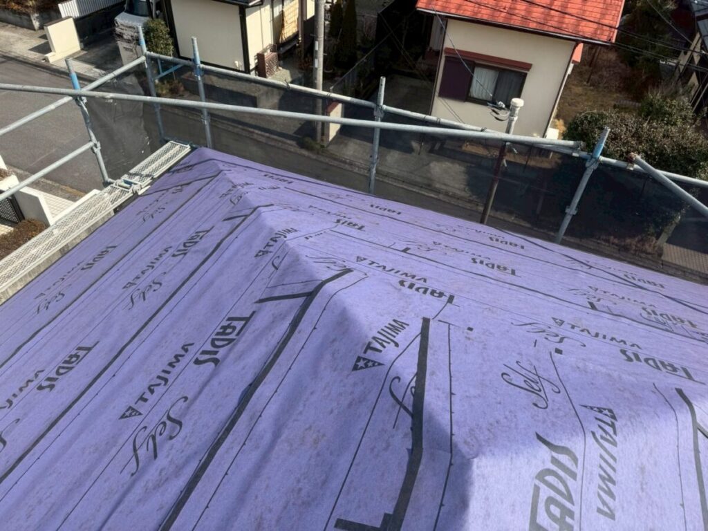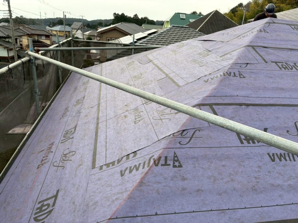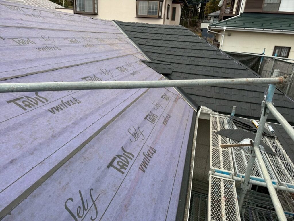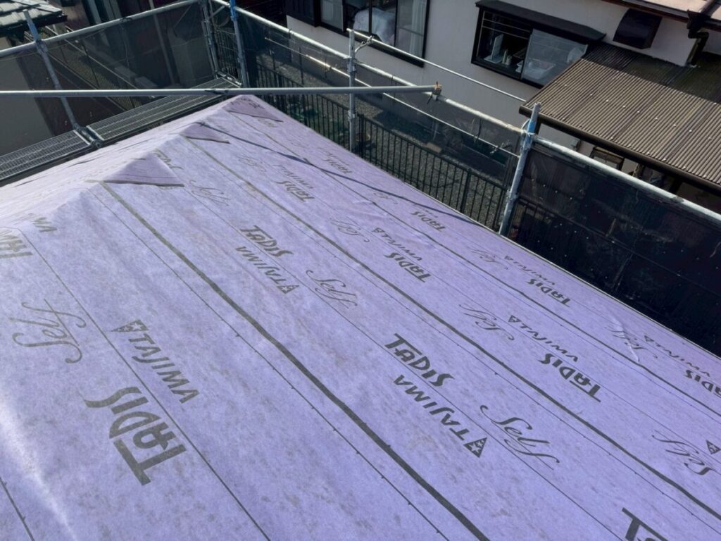 このルーフィングは、貼り直しができる施工性の良さに加え、耐候性・耐久性に優れているのが大きな特徴です。屋根材の下に隠れてしまう部分ではありますが、屋根工事において防水シートは非常に重要な役割を担っています。万が一、屋根材の隙間から雨水が入り込んだとしても、このルーフィングがしっかりと住まいを守ってくれます。見えない部分だからこそ、材料選びにはこだわりたいところです。