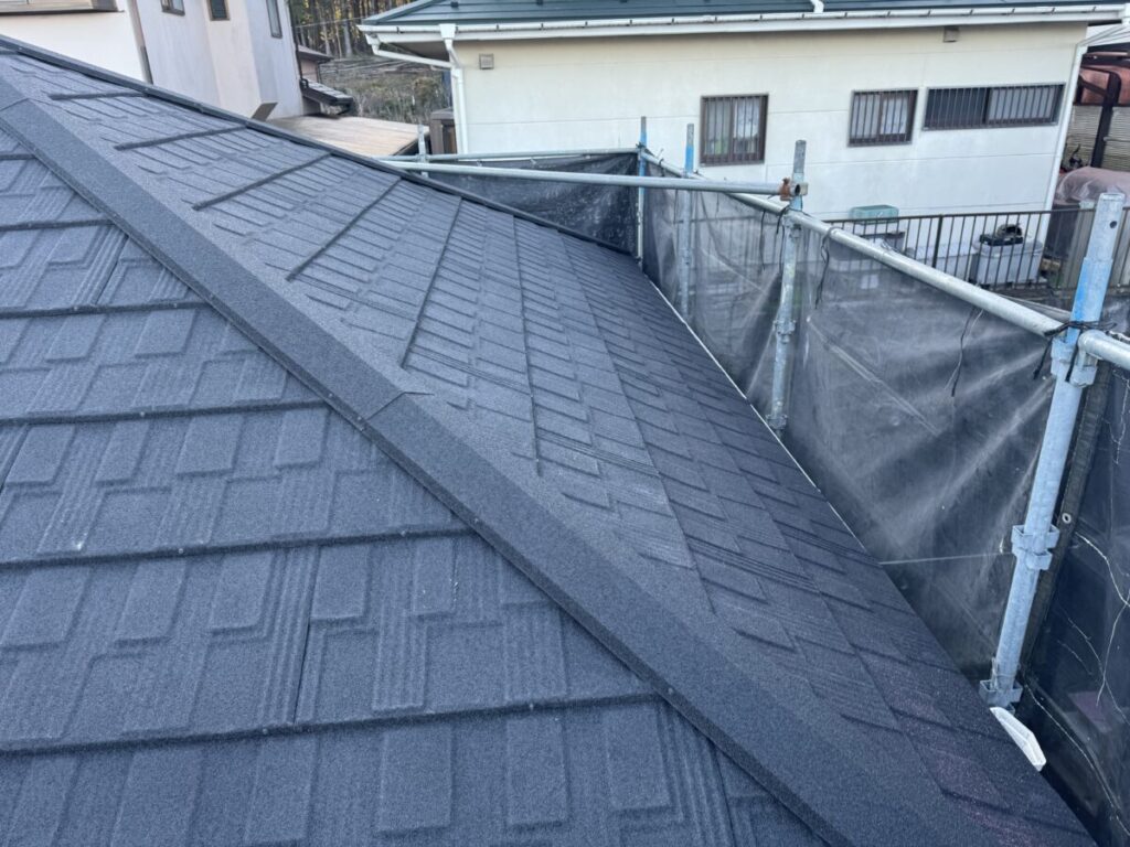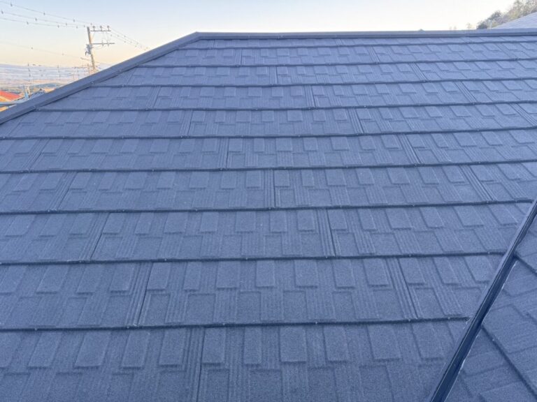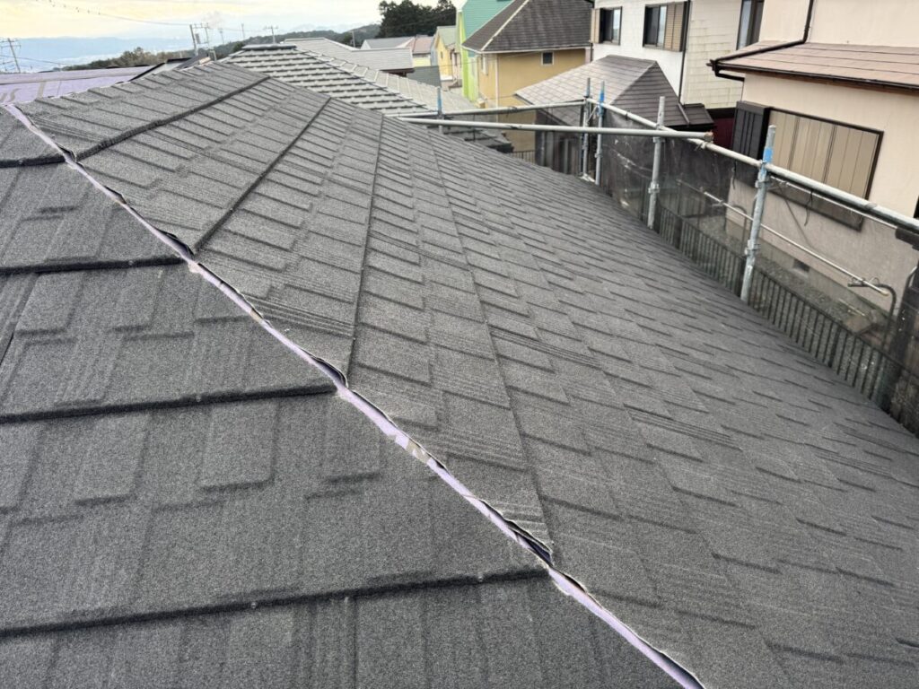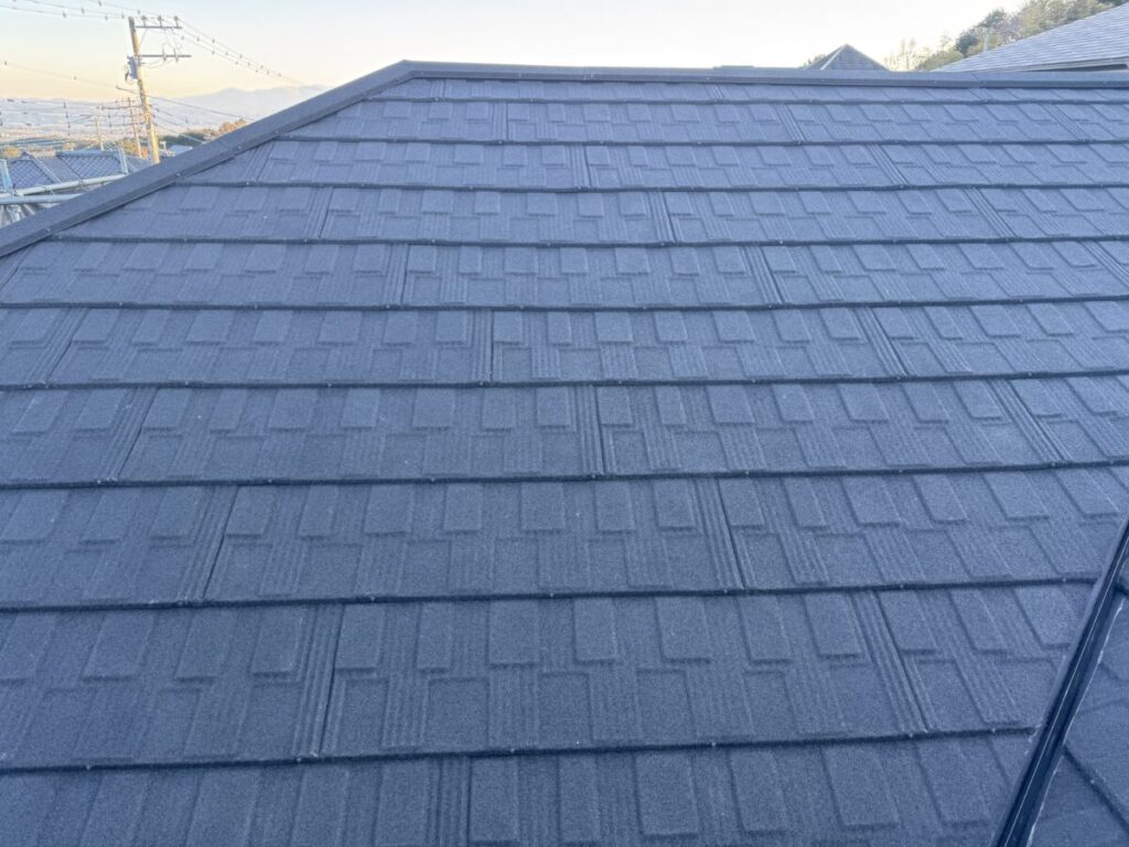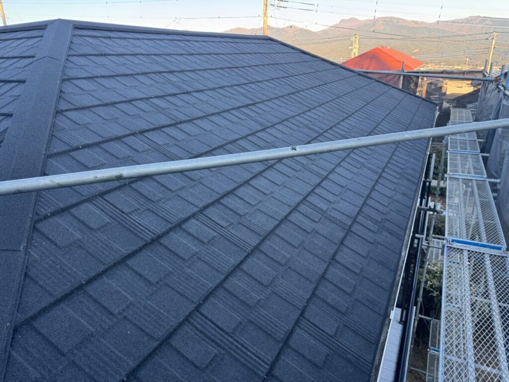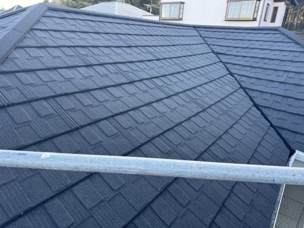 こうして、裾野市での化粧スレート屋根のカバー工法工事が無事に完了しました。既存屋根の上から施工することで、撤去費用や処分費を抑えつつ、屋根の性能をしっかり向上させることができます。見た目も大きく変わり、重厚感のあるきれいな屋根に生まれ変わりました。
