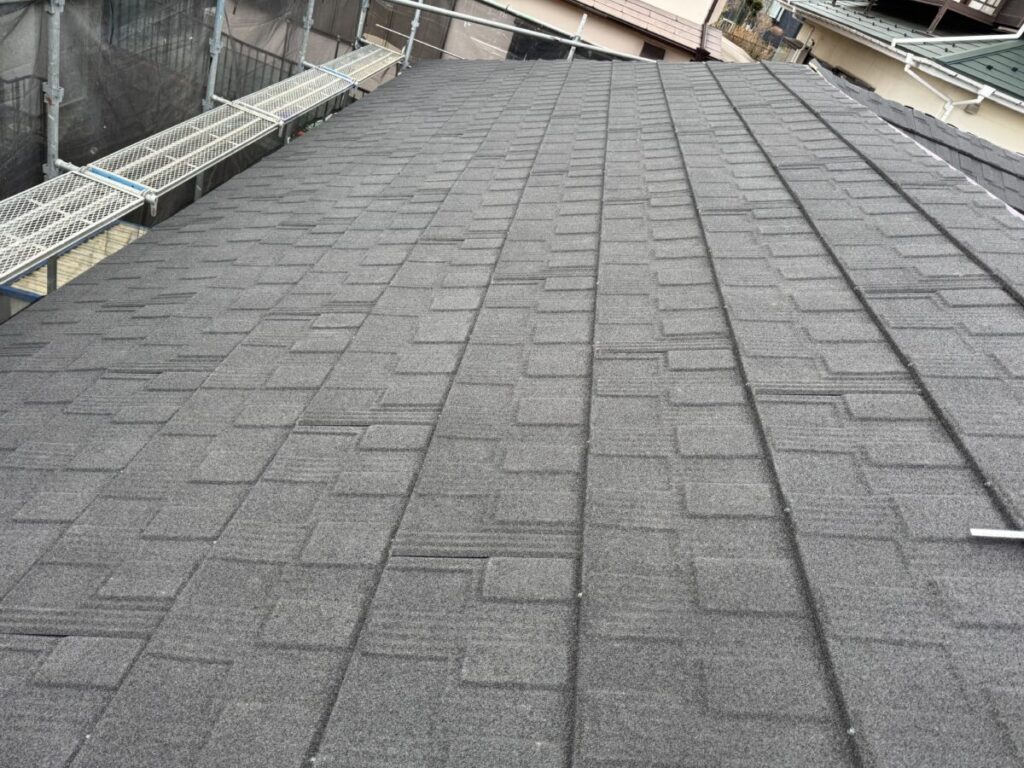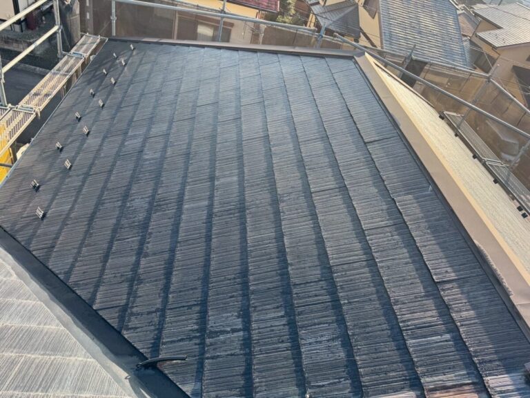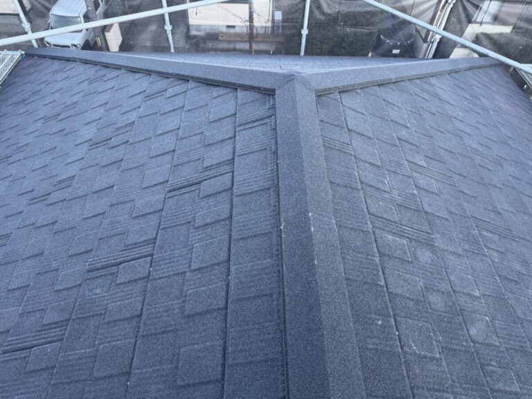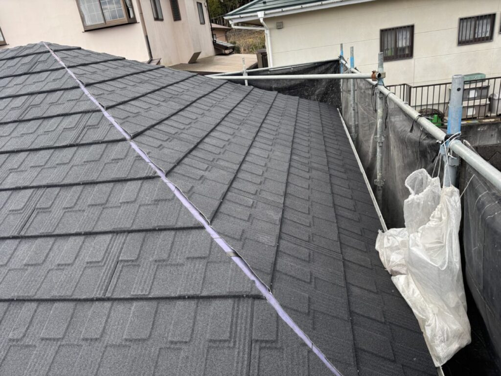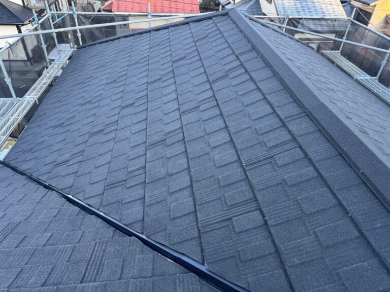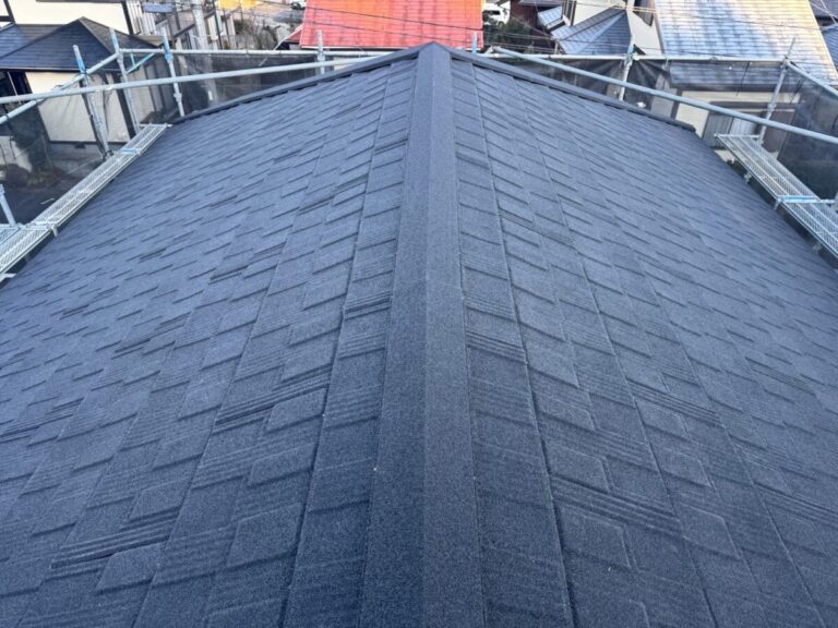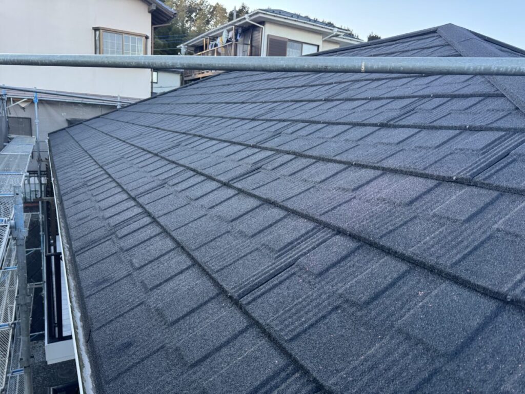 こうして、裾野市での化粧スレート屋根のカバー工法工事が無事に完了しました。既存屋根の上から施工することで、撤去費用や処分費を抑えつつ、屋根の性能をしっかり向上させることができます。見た目も大きく変わり、重厚感のあるきれいな屋根に生まれ変わりました。