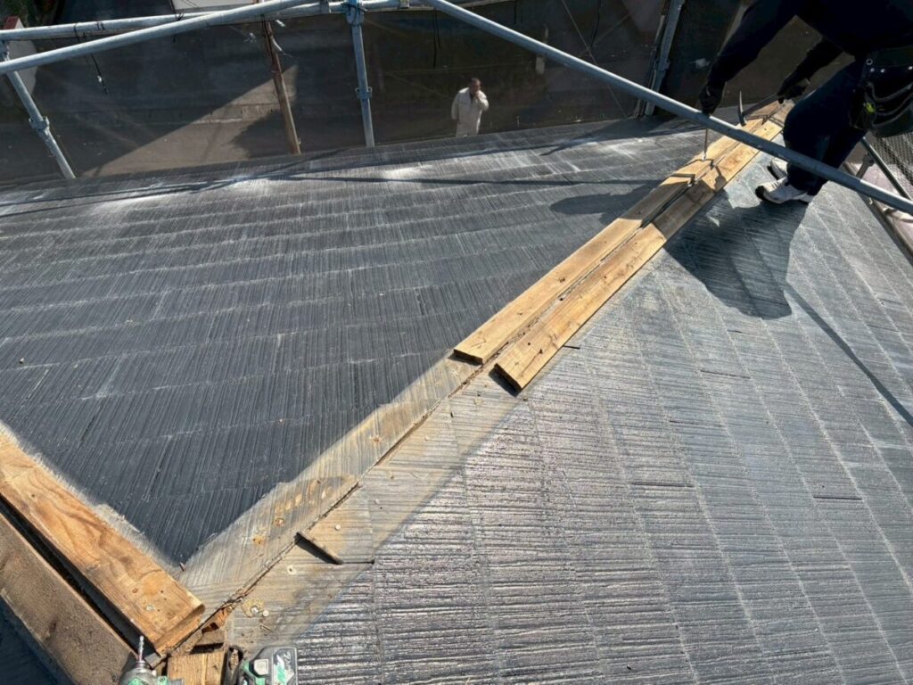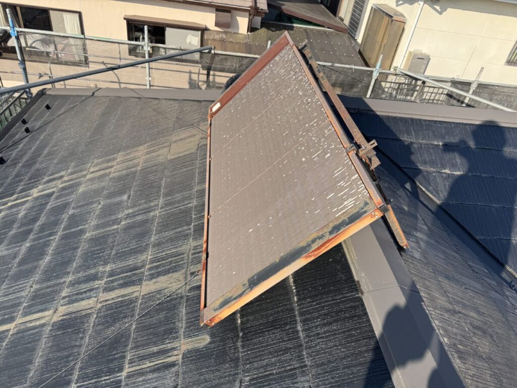 ドローンで確認したところ、屋根は築30年以上が経過していることもあり、全体的に経年劣化が進んでいる状態でしたが、屋根自体には大きな破損等ははありませんでした。お施主様は今後の雨漏りや飛散などを考え、屋根の全体的なリフォームをご希望されていましたので今回は、既存の屋根を撤去せずにその上から新しい屋根材を施工するカバー工法にて、LIXILのTルーフ モダンNをご提案させていただきました。屋根の上には太陽熱温水器のパネルが設置されており、こちらも長年の使用によって劣化が進んでいましたので撤去した後に屋根材を施工します。