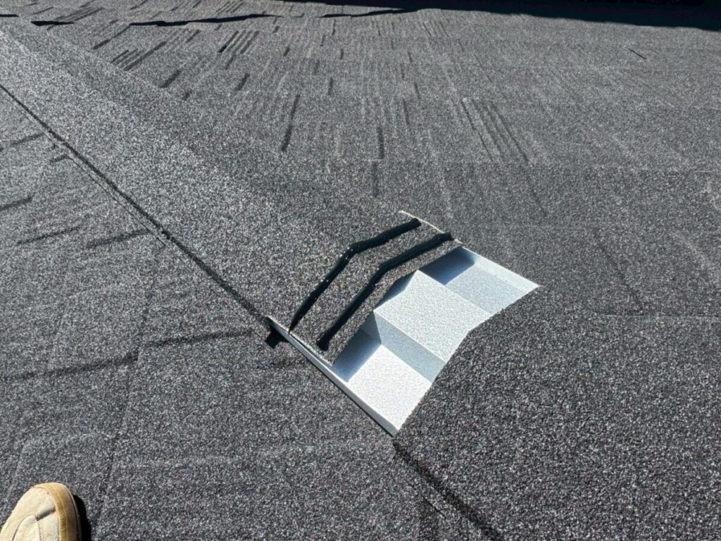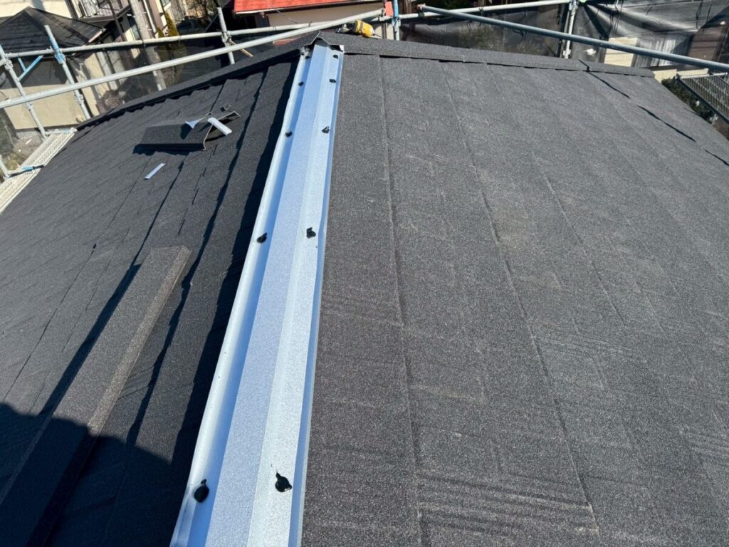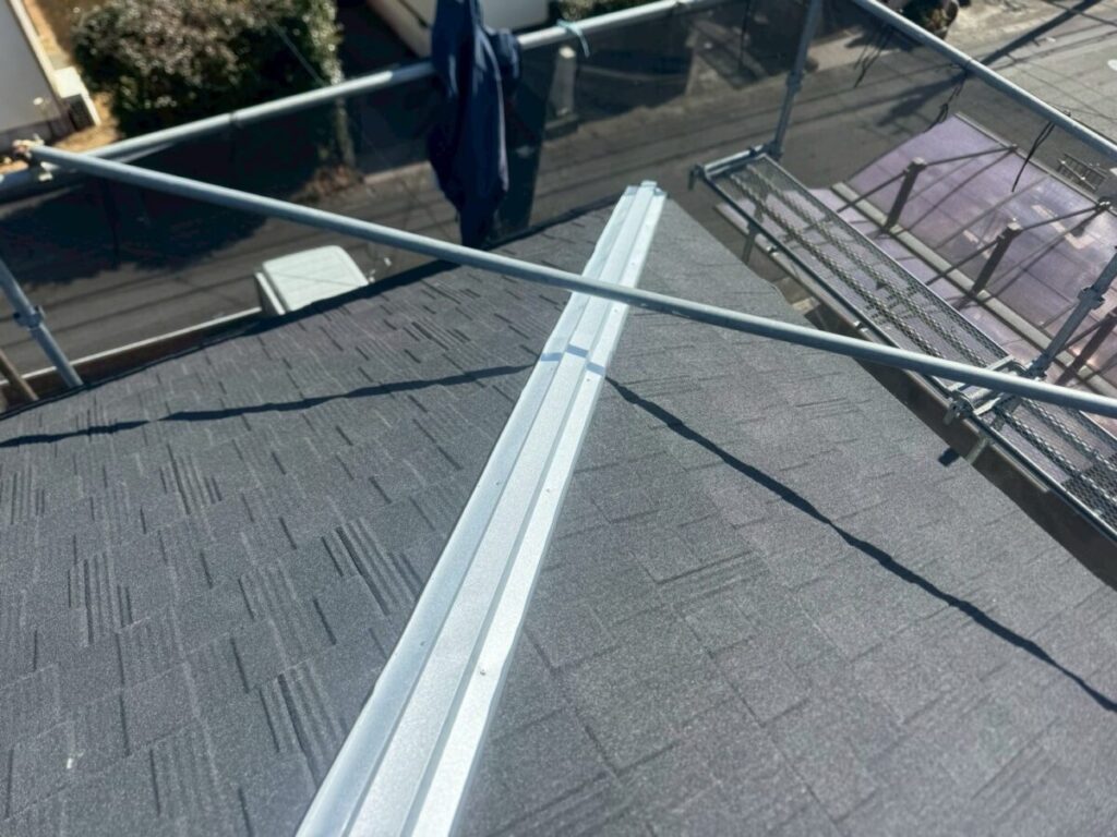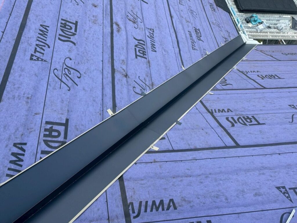 本体の施工が完了した後は、本体の張り合わせ部分に棟下地を取り付け、その上から棟板金を施工していきます。屋根の頂部にあたる棟部分は、雨仕舞いの面でもとても大切な箇所です。見た目をきれいに納めるだけでなく、雨水の侵入を防ぐためにも丁寧な施工が求められます。最後まで細かい部分に気を配りながら、しっかりと仕上げていきます。