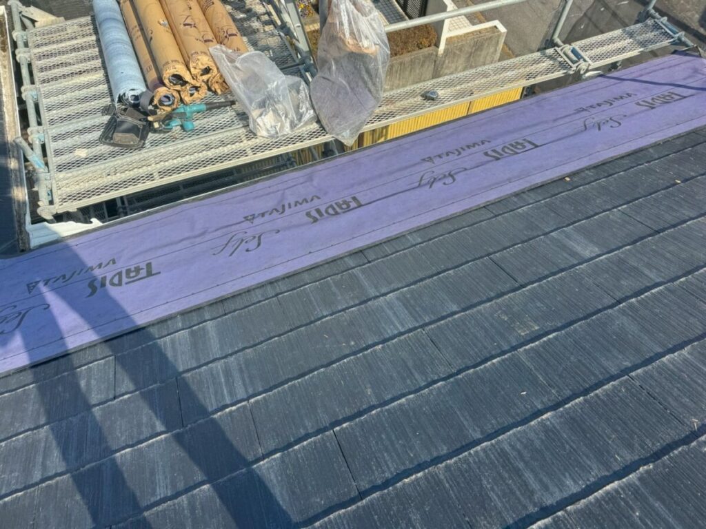 既存の化粧スレート屋根の上に軒先から順に、粘着層付きルーフィングを施工していきます。今回使用したのは、タディスセルフというルーフィング材です。