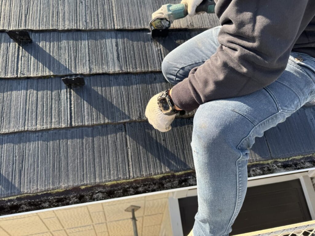 施工の初めには、既存の棟板金や雪止めの撤去を行っていきます。これらは新しい屋根材を重ねて施工する際に干渉してしまうため、事前に取り外しておく必要があります。今回は温水器のパネルがありますのでこちらも撤去します。