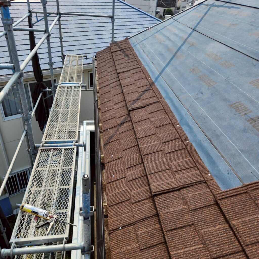 まずは既存屋根の上から、新しい防水層となるルーフィングを敷いていきます。ルーフィングは屋根材の下に施工される防水シートで、万が一屋根材の隙間から雨水が入り込んだ場合でも、建物内部へ水が回るのを防ぐ大切な役割があります。屋根工事では表に見える仕上がりも大事ですが、実際にはこの下葺き材の施工がとても重要になります。今回の施工には裏面に粘着層のあるルーフィングを使用しました。