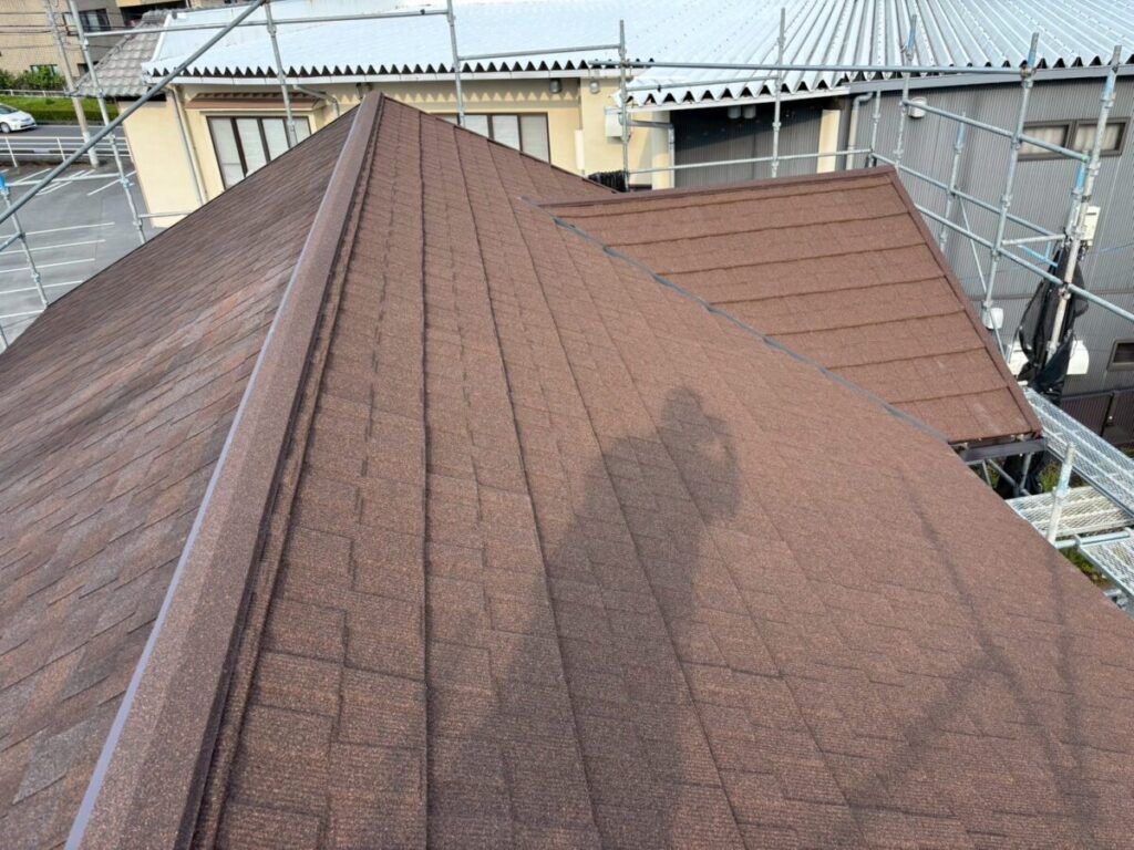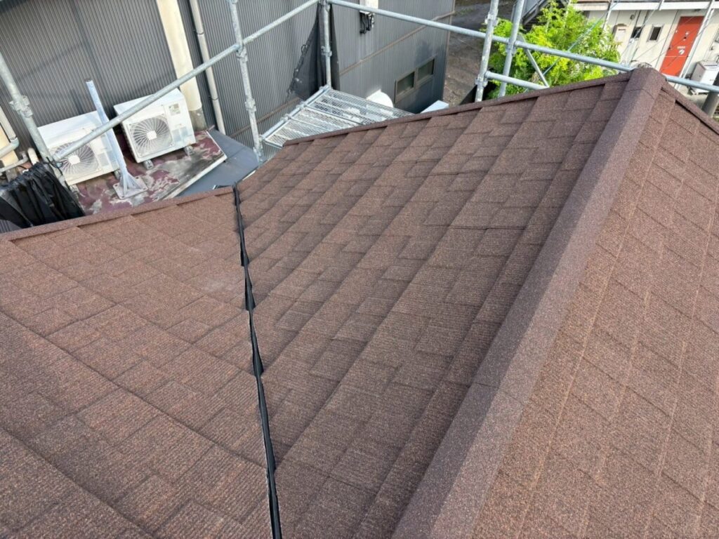 傷みが見られた南面がしっかりと新しい屋根材で覆われ、防水性・耐久性ともに向上した安心できる屋根に仕上がりました。セネター特有の天然石の風合いによって、仕上がりも重厚感があり、建物全体の印象も大きく変わったと思います。機能面だけでなく、見た目にも高級感のある屋根になりました。今回は南面だけの施工でしたが違和感なく仕上がりお施主様にも喜んでいただけました。