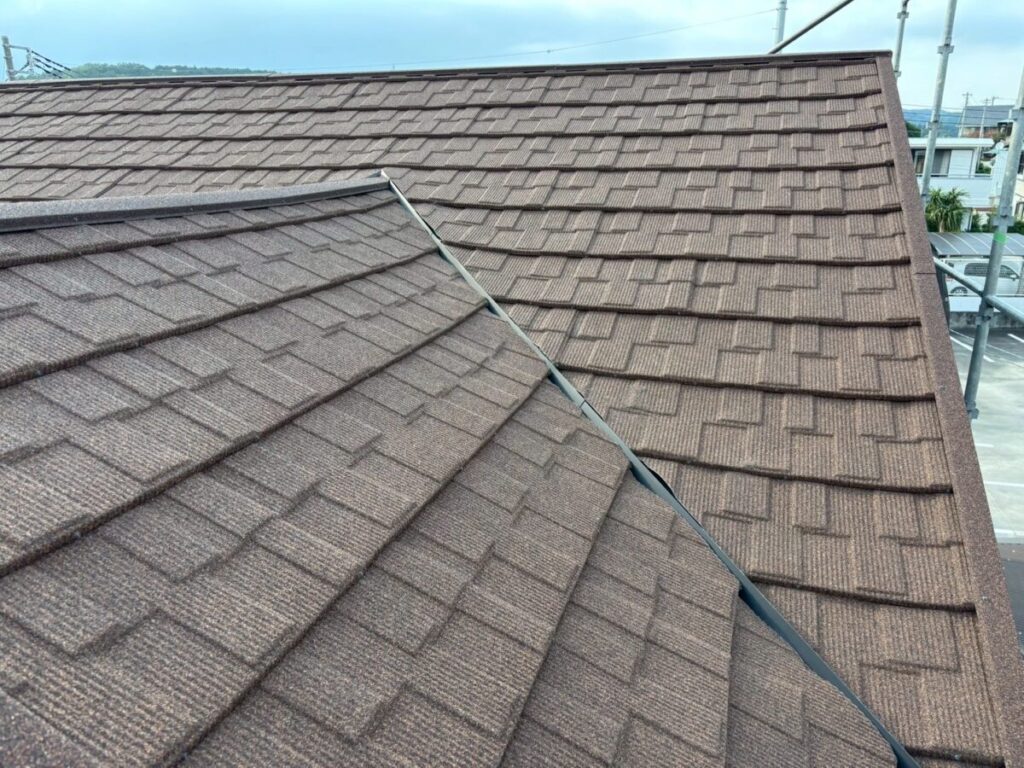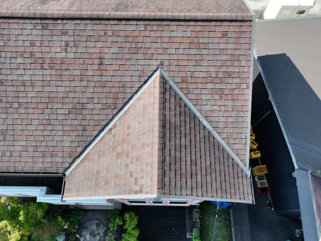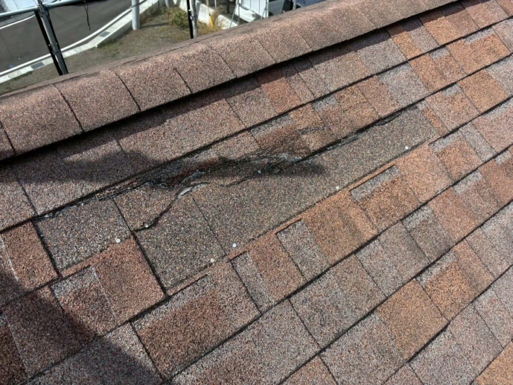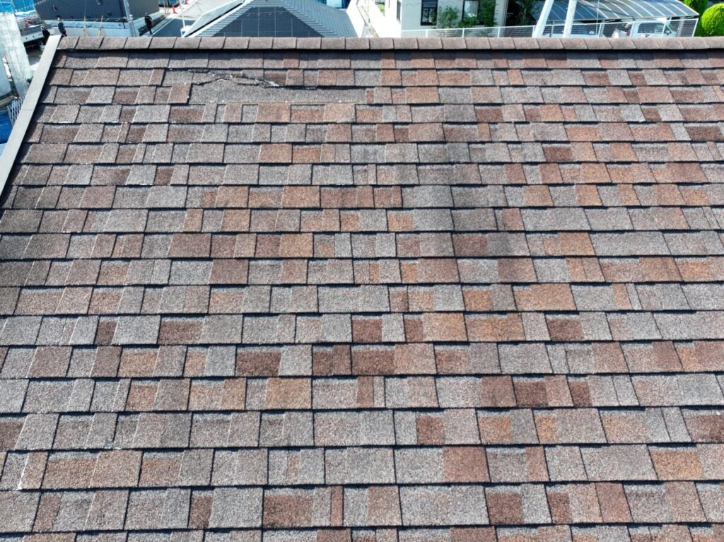 今回調査した屋根はアスファルトシングル葺きでしたが、確認の結果、屋根材の一部に破損が見られました。屋根材の傷みが進行すると、表面だけでなく内部へ雨水が入り込みやすくなり、雨漏りにつながるおそれがあります。とくに南面は紫外線の影響を受けやすく、劣化が進みやすい傾向があるため、早めの対処が必要な状態でした。